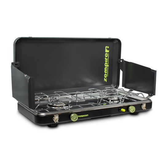 Our portable but spacious 2 Burner DLX Wide Stove features 2x high powered burners and an extra wide cooking surface to feed plenty at the campsite quickly. Includes a stove regulator with 1/4" NPT gas fitting to easily attach a separate propane canister. Equipped with adjustable feet to provide elevation and stability while cooking, along with foldable windshields which save gas and keeps flames hot. Cleaning is also made easy with a removable stainless steel pot rack. Tested in the remote campsites of New Zealand, our 2 Burner DLX Wide Stove is your dependable companion for camp cooking.