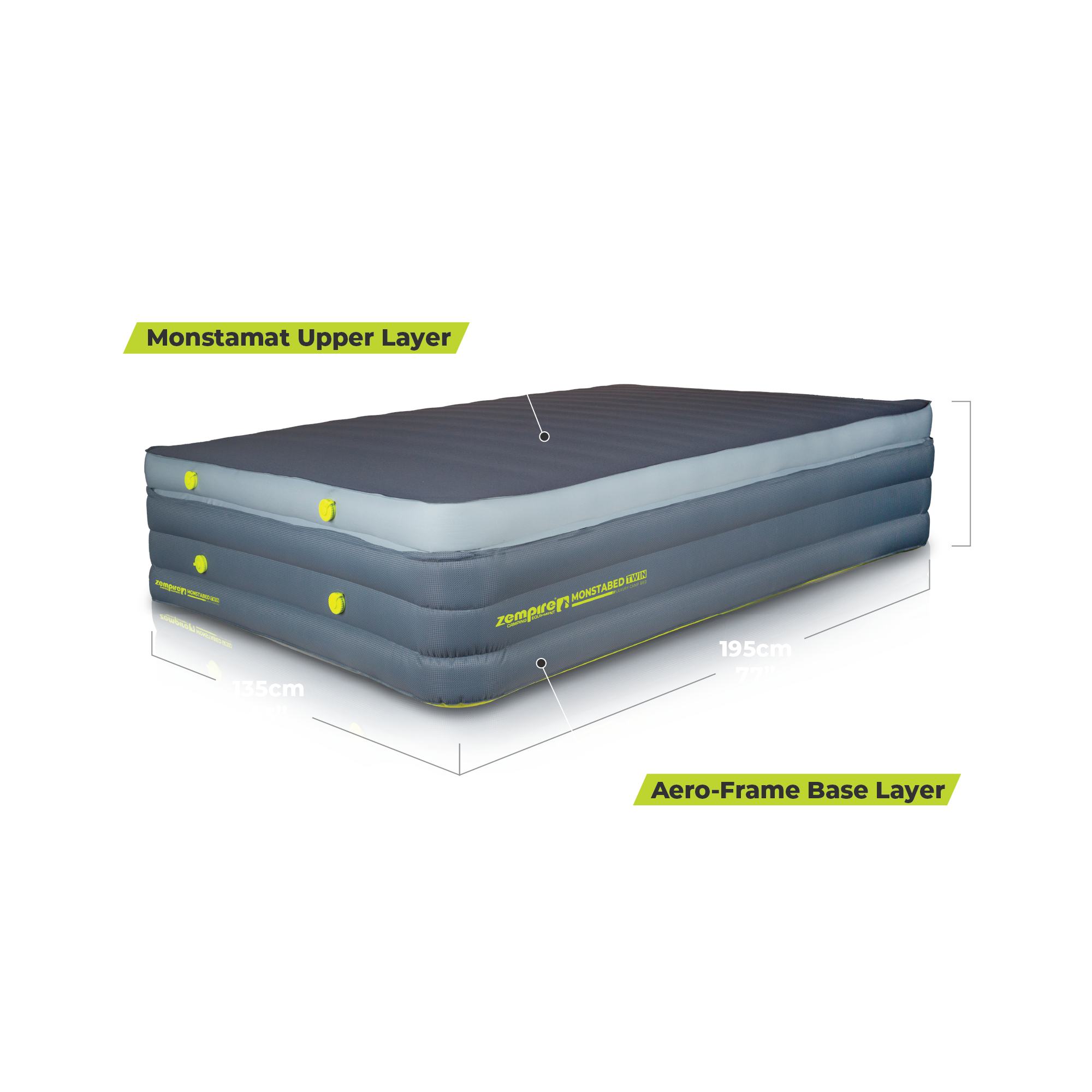 The Zempire Monstabed Twin is a premium camping mattress that combines the comfort of our Monstamat camping mat with the support of a durable inflatable airbed base. Designed as a spacious camp bed for two, it delivers home-like comfort without the need for a stretcher. This all-in-one camp bedding solution packs into a single carry bag for easy transport and inflates effortlessly with the Monstapump (sold separately). Experience next-level sleep at the campsite with this innovative airbed system.