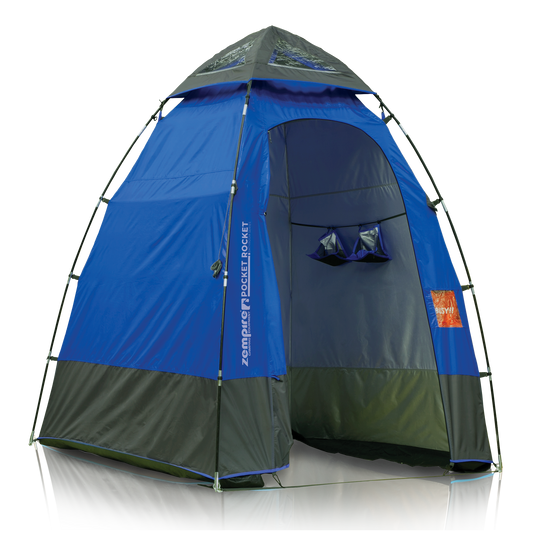 The Pocket Rocket is a campsite utility tent with a tall profile & sturdy fibreglass frame. Ideal for use as a changing station, toilet shelter, or shower tent. The silver-coated fabric provides total privacy by eliminating light transfer & shadows and the busy sign lets people know when the shelter is occupied. A waterproof towel curtain & hanging toiletry shelves keep your essentials organized.